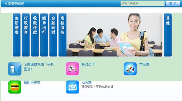 成功绑定银行卡之后,进入微信平台,通过悦生活下的生活缴费进入缴费页面:生活缴费→行政教育→学杂费