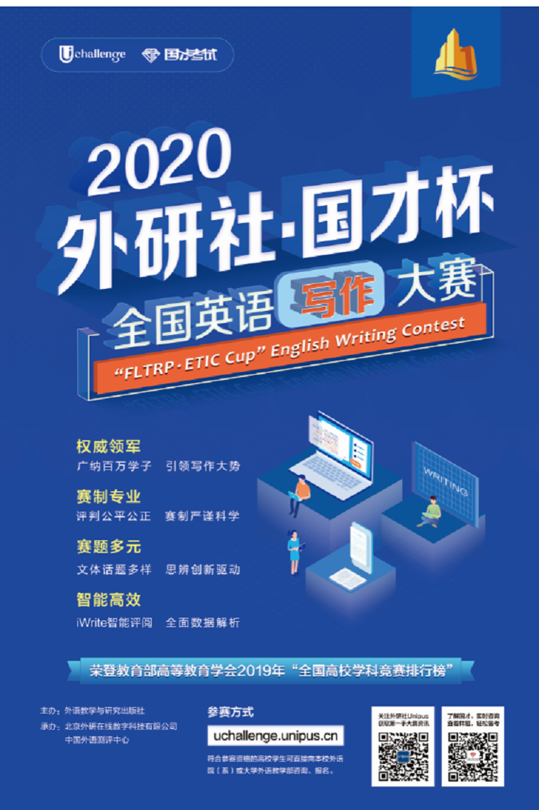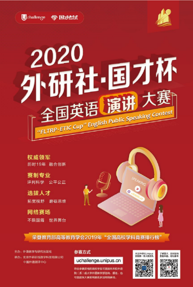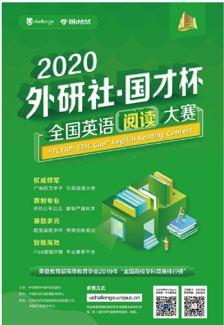 “Uchallenge大学生英语挑战赛”是由外语教学与研究出版社和中国外语与教育研究中心联合主办、北京外研在线数字科技有限公司和中国外语测评中心联合承办的公益大赛,包括“外研社·国才杯”全国英语演讲、写作、阅读三大赛事。大赛以培养具有国际视野、创新意识、家国情怀、未来精神的国际化人才为目标,引导大学生坚定文化自信、提升综合素养,推动话语表达与时代精神同向同进,是大学生呈现风采、实现自我的广阔舞台。
