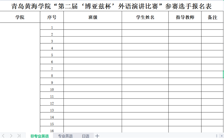 备注:800cc全讯白菜网主站“第二届‘博亚兹杯’外语演讲比赛”参赛选手报名表链接和样式附后