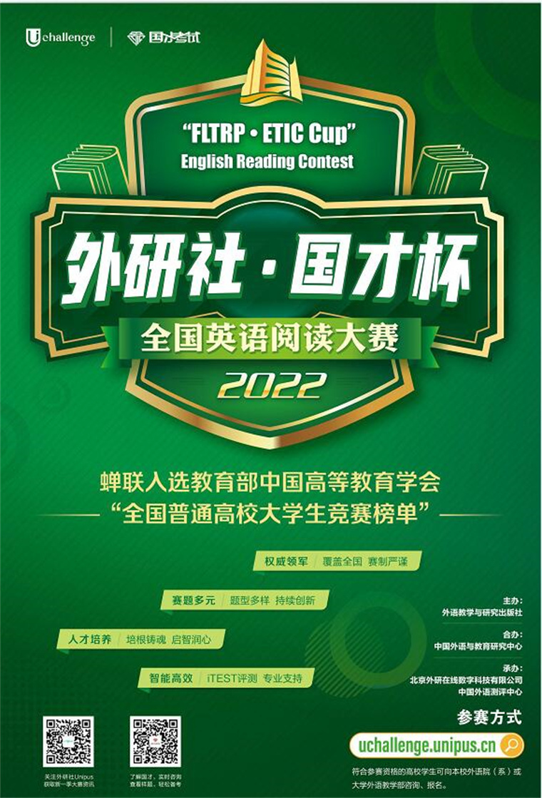 “外研社·国才杯”全国英语阅读大赛是由外语教学与研究出版社和中国外语与教育研究中心联合主办,北京外研在线数字科技有限公司和中国外语测评中心联合承办的大型公益赛事。大赛于 2015 年开始举办,旨在通过比赛的设置,引导大学生进行多文本、多体裁、多元化的英文原版阅读,通过广泛阅读获取新知、启迪思考、增长智慧。凭借其权威性、学术性和专业性,大赛连续多年入选教育部中国高等教育学会发布的“全国高校大学生竞赛榜”,被全国多地教育主管部门纳入省厅级比赛项目。大赛在引领理念、培养人才、推动教学等方面的成果备受认可。