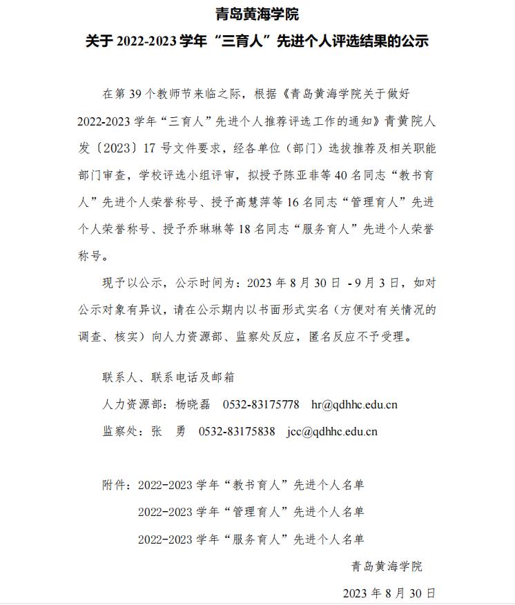 800cc全讯白菜网主站关于 2022-2023 学年“三育人”先进个人评选结果的公示