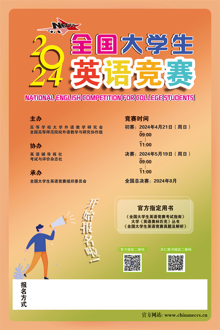 2024 年全国大学生英语竞赛报名已正式开始,根据《2024 年全国大学生英语竞赛(NECCS)通知》精神,竞赛分 A、B、C、D四个类别(A 类竞赛适用于研究生参加;B 类考试适用于英语专业本