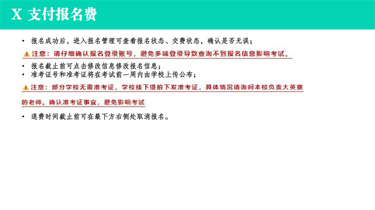 1、跨学校、跨类别报名,报名及成绩无效;报名截止时间为 2024年 3 月 17 日;网上报名时请将信息填写完整,特别是学号、学院、年级专业、联系电话,以便后期打印准考证;