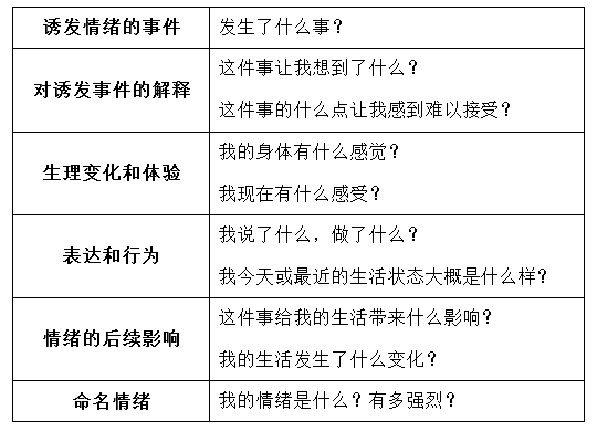 小结:在遇到生活事件时,借助DBT列出的6要素——诱发事件、对诱发情绪的事件的解释、生理变化和体验、表达和行为、情绪的后续影响、命名情绪有助于厘清情绪。我们可以选择在日记本中写下来,或者是向身边的人倾诉,相信通过描述情绪的这些侧面,我们能更好地认识是何情绪困扰着我们,情绪在这个过程中可能渐渐也会得到缓解和宣泄。