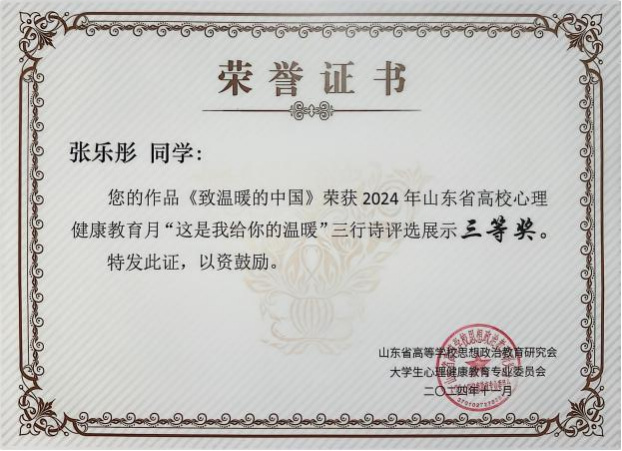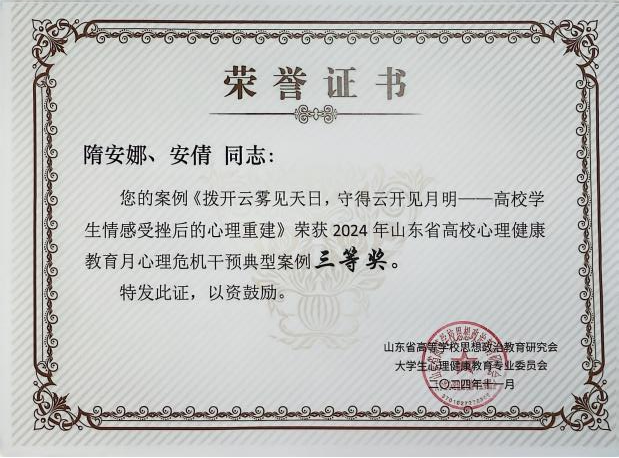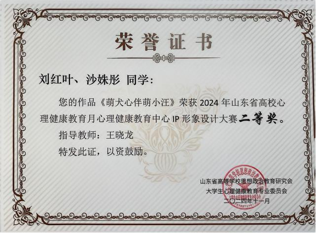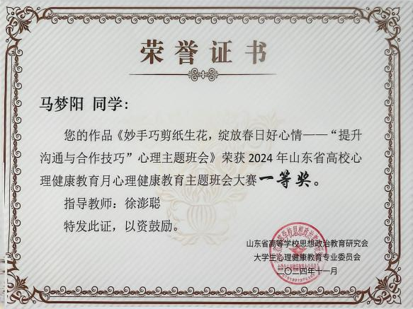 在山东省高等学校思想政治教育研究会、大学生心理健康教育专业委员会组织的2024年山东省高校心理健康教育展示大赛中,全讯白菜师生再获佳绩,共计6项作品获奖,其中一等奖1项、二等奖2项、三等奖3项。