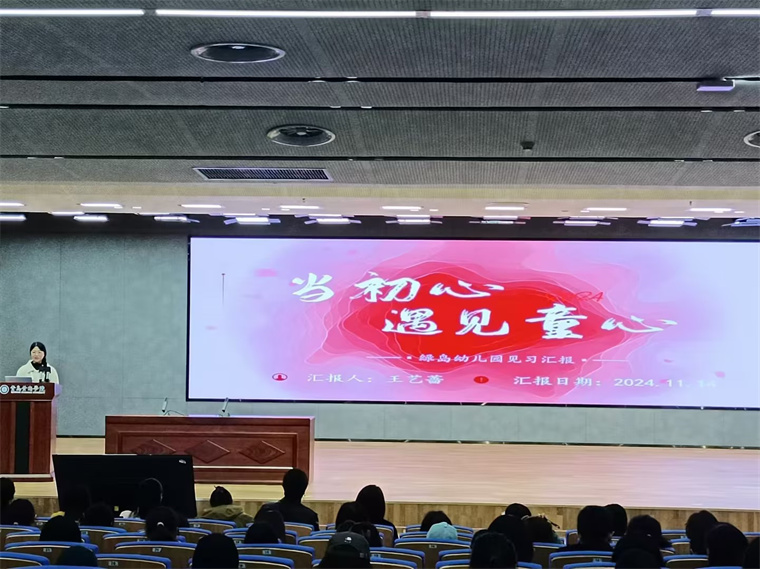 为全面展示教育见习成果,强化同学们对教育实践过程的反思与总结,2024年11月14日下午16:00,教育学院于知信楼B01报告厅召开“2022级学前教育本科教育见习分享大会”,出席本次会议的有教育学院院长助理刘艺敏、教育学院教学秘书杨英超、学前教育教研室(一)主任毛玉蕊、学前教育教研室(二)主任罗雅会以及顾娟老师、隋洁老师、李昕老师等见习指导教师,全体2022级学前教育本科生参会。