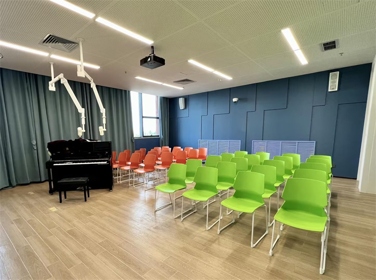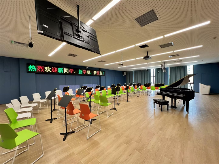 学校坐落在国家级新区——青岛西海岸新区核心位置,交通便利,山海相间,气候宜人,宜学宜居;校内教学环境与基础设施优良,学校新建智慧AI教学楼——知信楼,配有合唱实训室、声乐实训室、舞蹈实训室、综合艺术实训室、音乐教育活动实训室、演播厅等8间,教师、学生琴房共60间,均已安装空调及人脸识别智慧预约系统,充分满足学生学习需求。