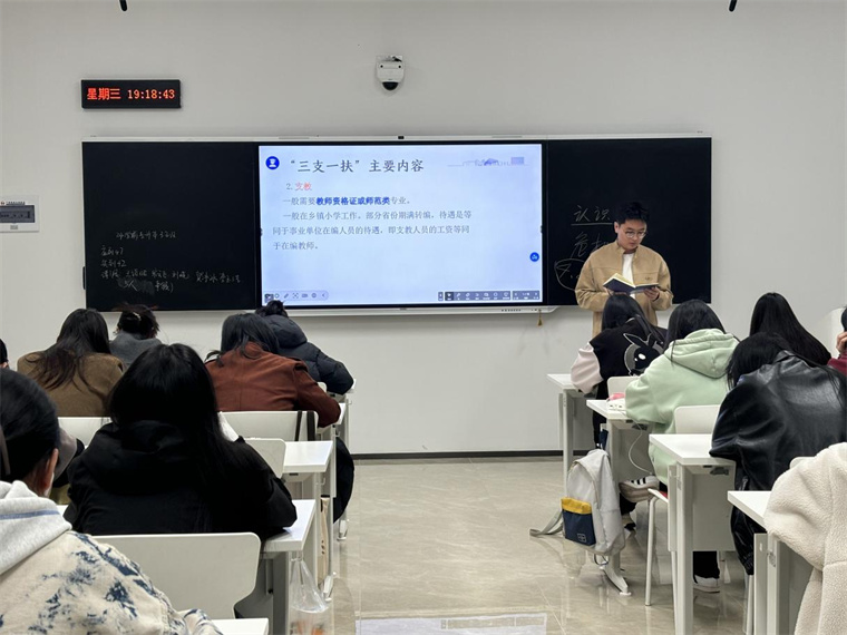 在讲解过程中,结合往年本校学生参与 “三支一扶” 计划的实际经历,分享他们在基层的工作日常、成长收获与感人故事,让同学们对 “三支一扶” 工作有了更直观、更深刻的认识。同学们积极提问,就考试内容、专业匹配度、服务期间的生活保障等个人关心的问题与辅导员进行深入交流。辅导员们耐心倾听,一一作出详尽解答,并根据同学们的专业特点和职业规划,提供个性化的建议,鼓励大家结合自身情况,积极投身到 “三支一扶” 计划中,在基层广阔天地中施展才华、实现价值。