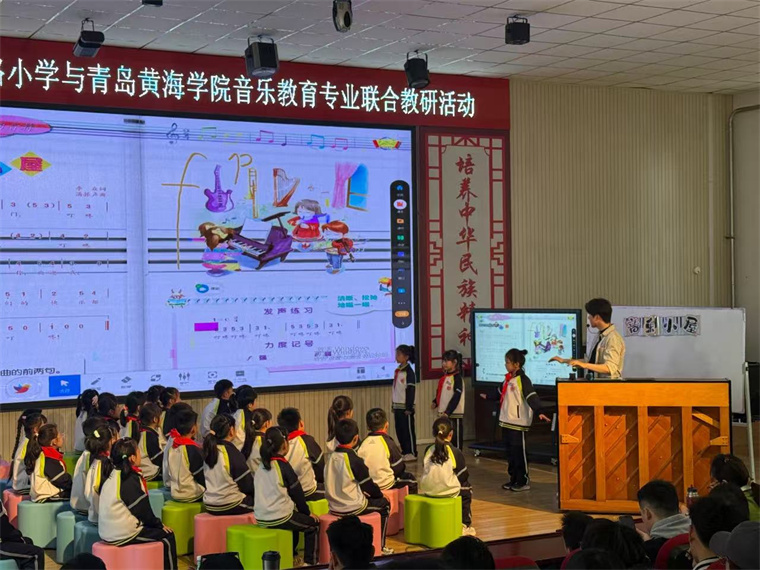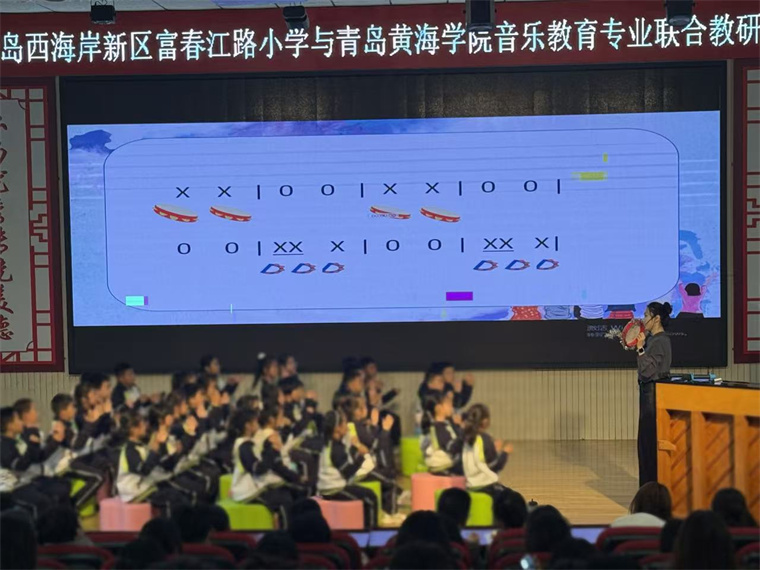 为深化高校与地方基础教育协同发展,推动教学理念与实践深度融合,2025年5月8日下午,800cc全讯白菜网主站携手青岛西海岸新区富春江路小学,共同开展音乐学科创新融合教研活动。旨在通过高校与小学的共建合作,探索AI智慧赋能在音乐课堂教学中的应用新模式。活动由富春江路小学杨艺主任主持,富春江路小学于婕校长、800cc全讯白菜网主站教育学院音乐教育专业近200名师生参与教研实践。