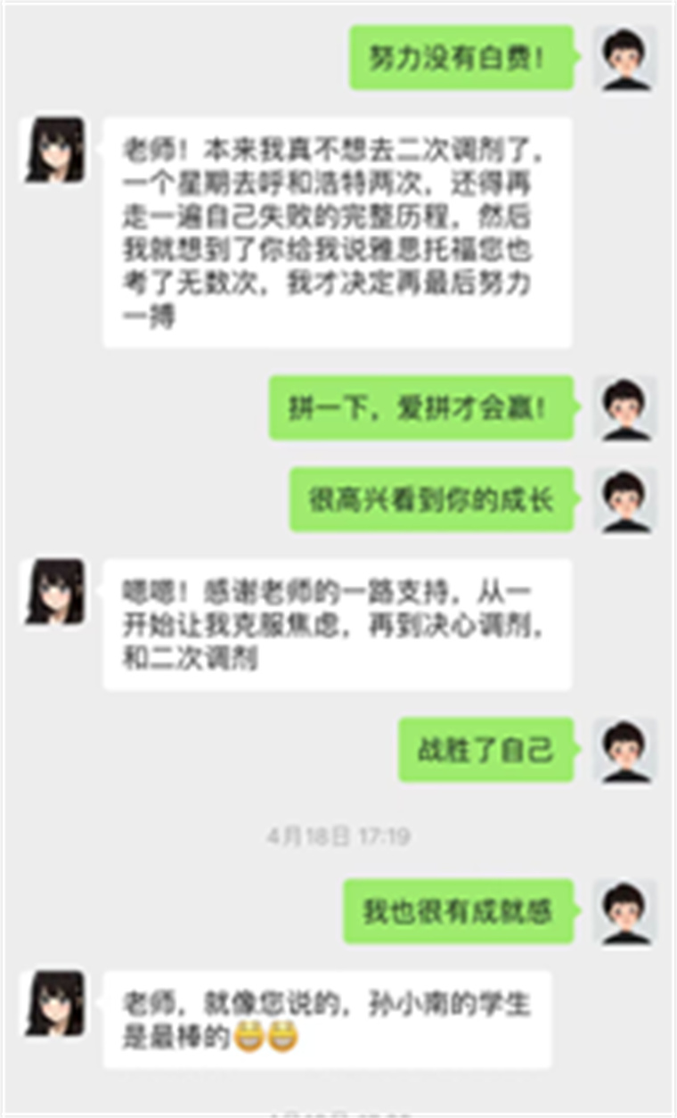 当我在幼儿园午休室叠第27床小被子时,辅导员孙老师的语音消息点亮了手机:"教育是场马拉松,调剂站不是终点"。我还是焦虑到崩溃,一个人在走廊跟孙老师打电话,孙老师在电话里不断的鼓励我,让我相信自己,让我坚持,让我争取,我们通话了近一个小时,是孙老师把我从崩溃中拉回来。在此之后,孙老师也时常跟我发微信关心我的状态,帮我准备考研调剂院校所需的资料,孙老师为我的付出,成了我的巨大动力。