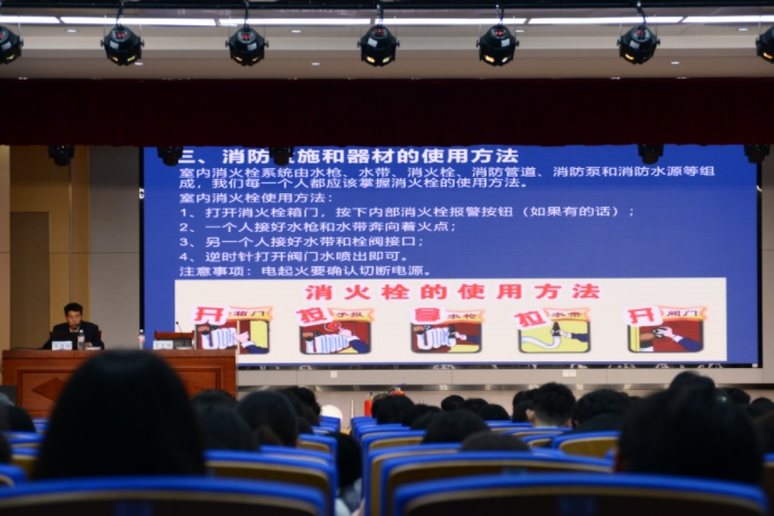 在消防安全知识宣讲环节,张工程师通过真实火灾案例,深入浅出地讲解了火灾常见起因、发生火灾后的应急处置措施、微型消防站消防设施和器材的使用方法、应急疏散与逃生。结合近年来高校火灾数据,他特别强调了宿舍违规用电、吸烟、充电设备不当使用等隐患的危害。