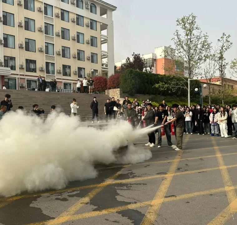 疏散演练结束后,安全管理处工作人员详细讲解火灾预防、逃生技巧及灭火器使用方法,重点演示了“提、拔、握、压”灭火器四步操作法和“甩带、连接、抱握”标准化动作,并设置了油盆灭火场景,组织师生分批次参与灭火器灭火和消防水带灭火实操。