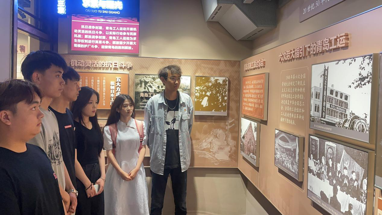 在讲解员的引导下,入党积极分子们首先进入序厅,通过落地大屏的一段视频,同学们了解到百年来工人阶级为拯救国家、发展工业所作出的成就和贡献,被先辈们的光辉事迹和革命精神所震撼和感动。“四大主题展厅由四个篇章组成,分别是艰难历程中的青岛工运、新中国的主人翁、改革开放的主力军;新时代的青岛工运。”跟随讲解员的脚步和声音,一幕幕令人震撼的历史画面透过一张张珍贵的历史照片和一段段文字呈现在眼前,再现了工人运动的起源发展以及波澜壮阔的革命历程。新中国成立后工人阶级担负重任,各级工会组织工人开展一系列活动;展现了改革开放过程中工人阶级作为主力军所彰显的强大力量,以及青岛作为品牌之都的魅力。通过学习自19世纪末以来青岛工人阶级的诞生与发展历程,切实感受青岛工人阶级在中国共产党领导下推翻反动势力、取得辉煌成就的非凡历程以及在新中国成立后工会工作的发展情况,入党积极分子们感受颇深。