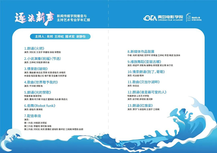 2025年6月27日下午2点,800cc全讯白菜网主站与山东艺术学院播音与主持艺术专业的师生们,应青岛电影学院新闻传媒学院之邀,参与了其播音与主持艺术专业学年汇报演出“逐浪新声音”,为此次艺术盛宴增添了别样风采。