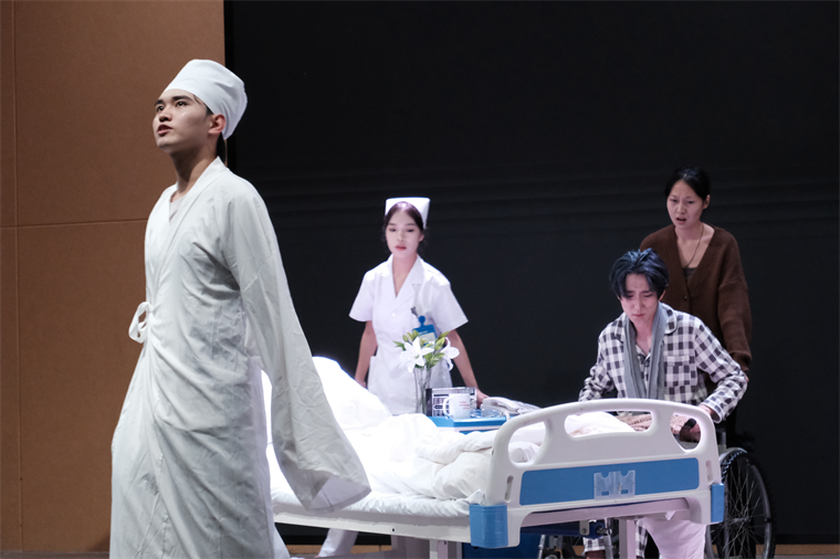 王梓同学用流行音乐表达了饰演老陶的体悟,张钟涛老师用家乡的婺剧唱腔演唱古文《桃花源记》片段,借韵律与词句,勾勒出老陶的特质与命运。作品展现了老陶从情伤沉郁到心境释然的爱情故事,映照出他对人生际遇的深深不甘与无奈。