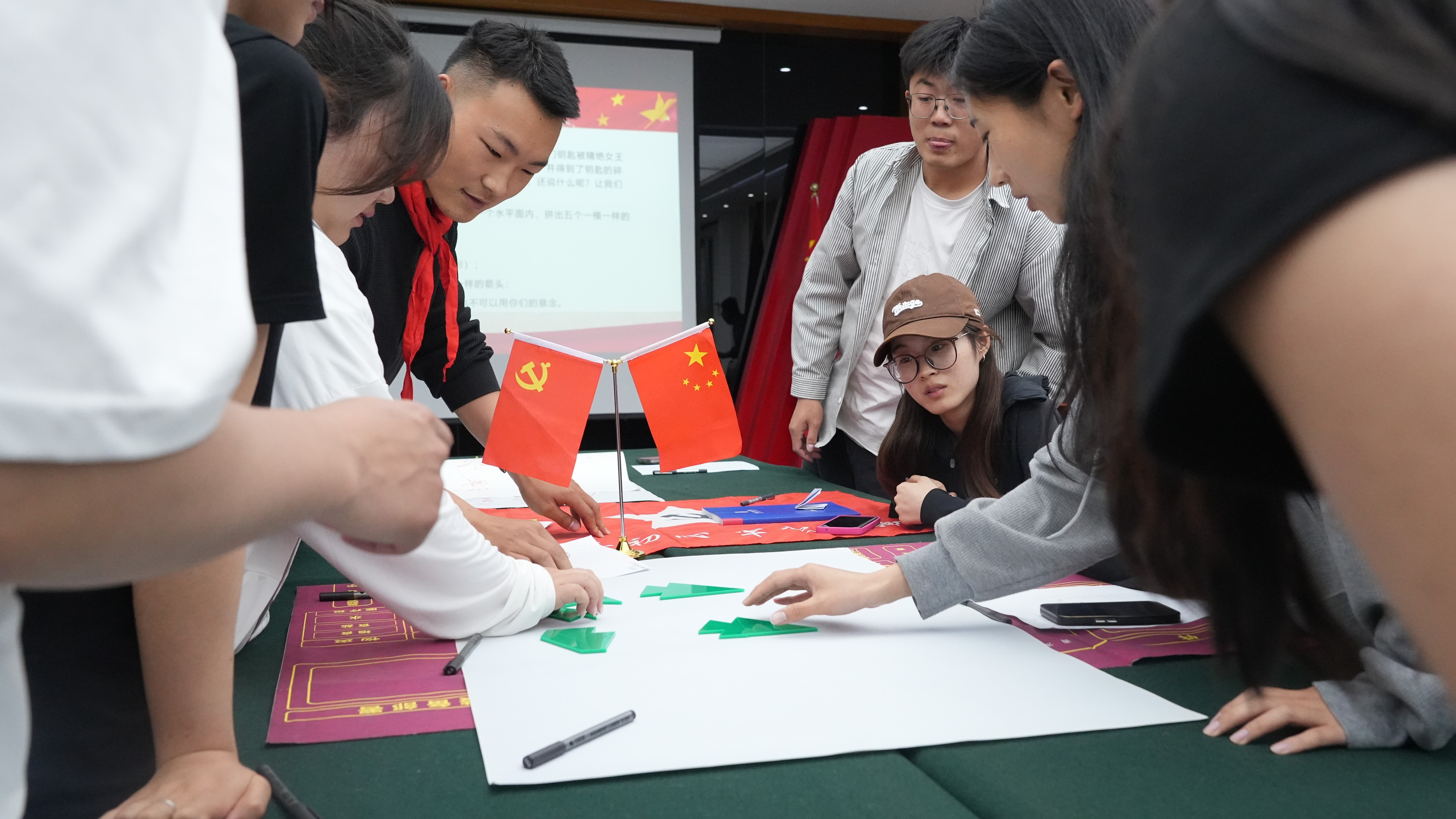 “重走长征路”情景模拟沙盘演练活动中,沈老师要求各小组团结协作、发散思维,利用七巧板、一次性筷子、鸡蛋、拼图等道具完成“长征故事研讨”“捆绑手榴弹”“拼装寻宝钥匙”的既定任务,按照各小组完成的成绩得到相应的积分,同时在过程中分享长征故事、观看革命影视作品,最终积分前两名的两个军团胜利会师。最后,各小组总结长征伟大精神,绘制“重走长征路”学习卡并阐释自己心中的长征精神。