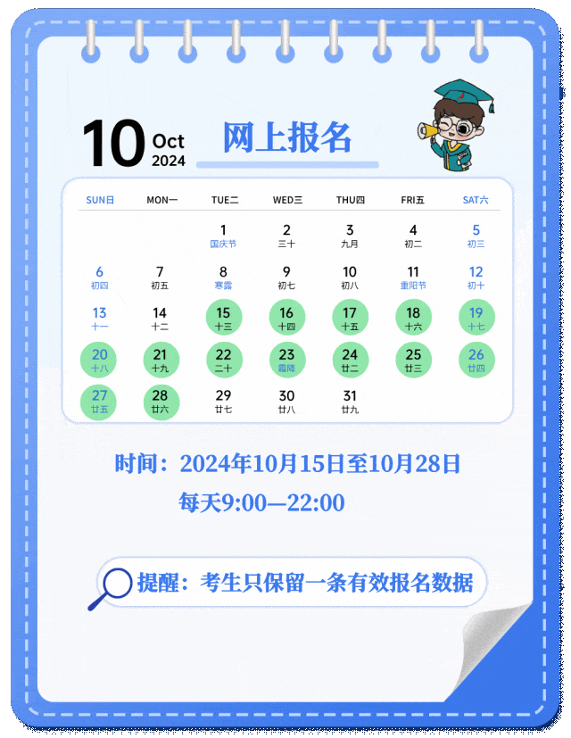 全国硕士研究生招生考试报名包括网上报名和网上确认两个阶段。其中,网上报名时间为2024年10月15日至10月28日(网上预报名时间为2024年10月9日至10月12日,相关工作安排由各省级教育招生考试机构确定并公布),每日9:00~22:00。网上确认时间由各省级教育招生考试机构确定并公布。