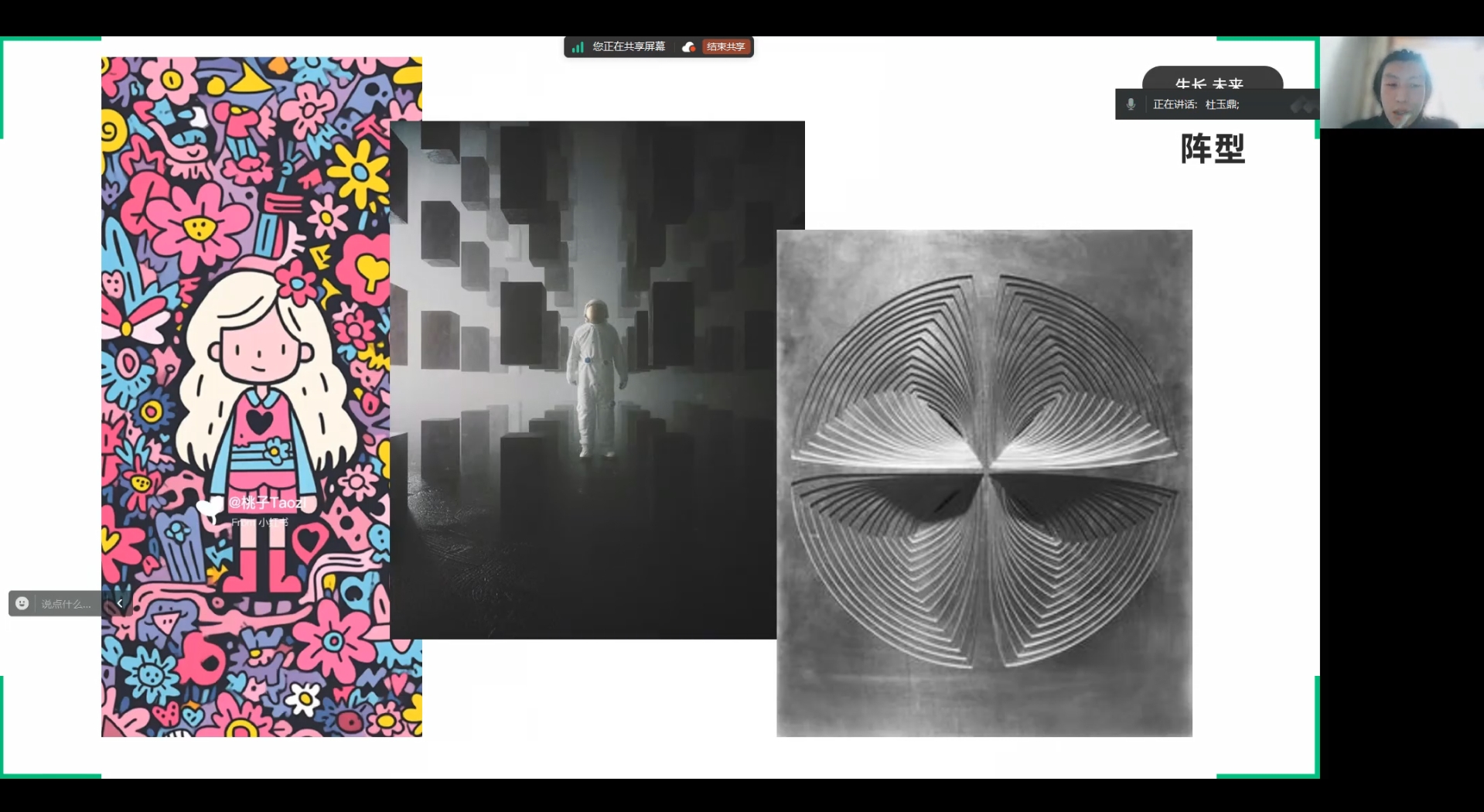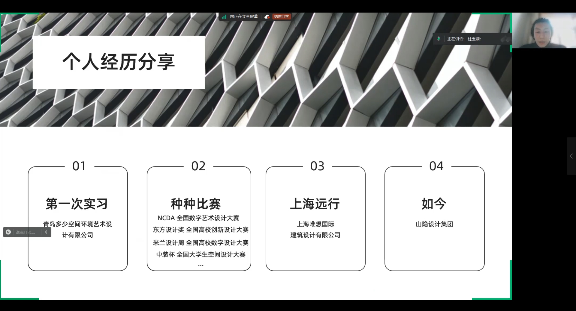 杜玉鼎设计师主要以学习与工作为切入探究点,结合自身的学习成长经历与工作实践感想。基于设计理念创新构思体系,运用多元构成设计方法进行设计分析与解析,以生活与艺术视角,结合案例分享个人设计理解与认知,并与线上、线下同学进行了有趣的交流与互动,帮助大家更好的认识专业,以更加实践的视角发现生活细节,用心去做好每一个设计。