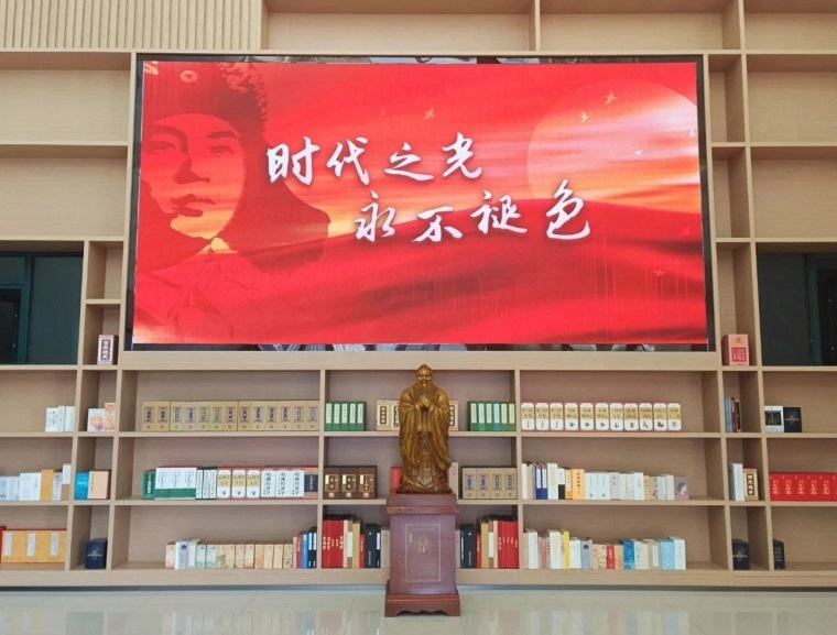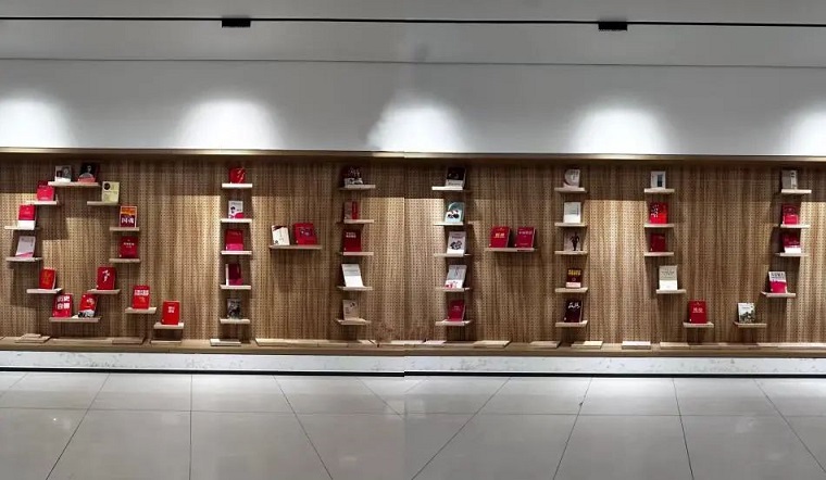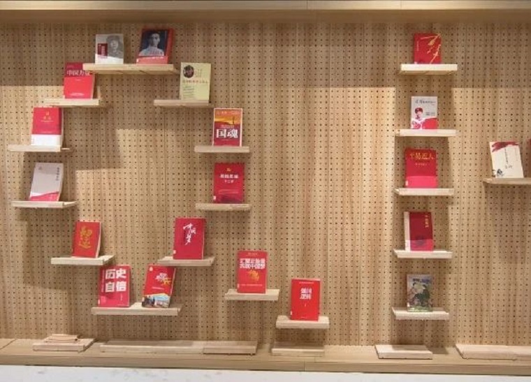 灯光下,书架板构成的字母泛着微光,宛如一座“精神灯塔”,与周围雷锋书籍交相辉映。