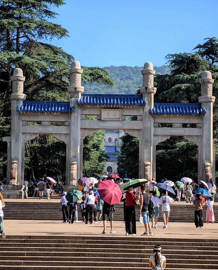 团队首站抵达中山陵,其“警钟形”中轴布局与392级台阶的仪式感,让同学们深刻体会到传统礼制空间的现代转译价值。“从博爱坊到祭堂的序列,不仅是建筑语言的表达,更是一种民族精神的符号化设计。”