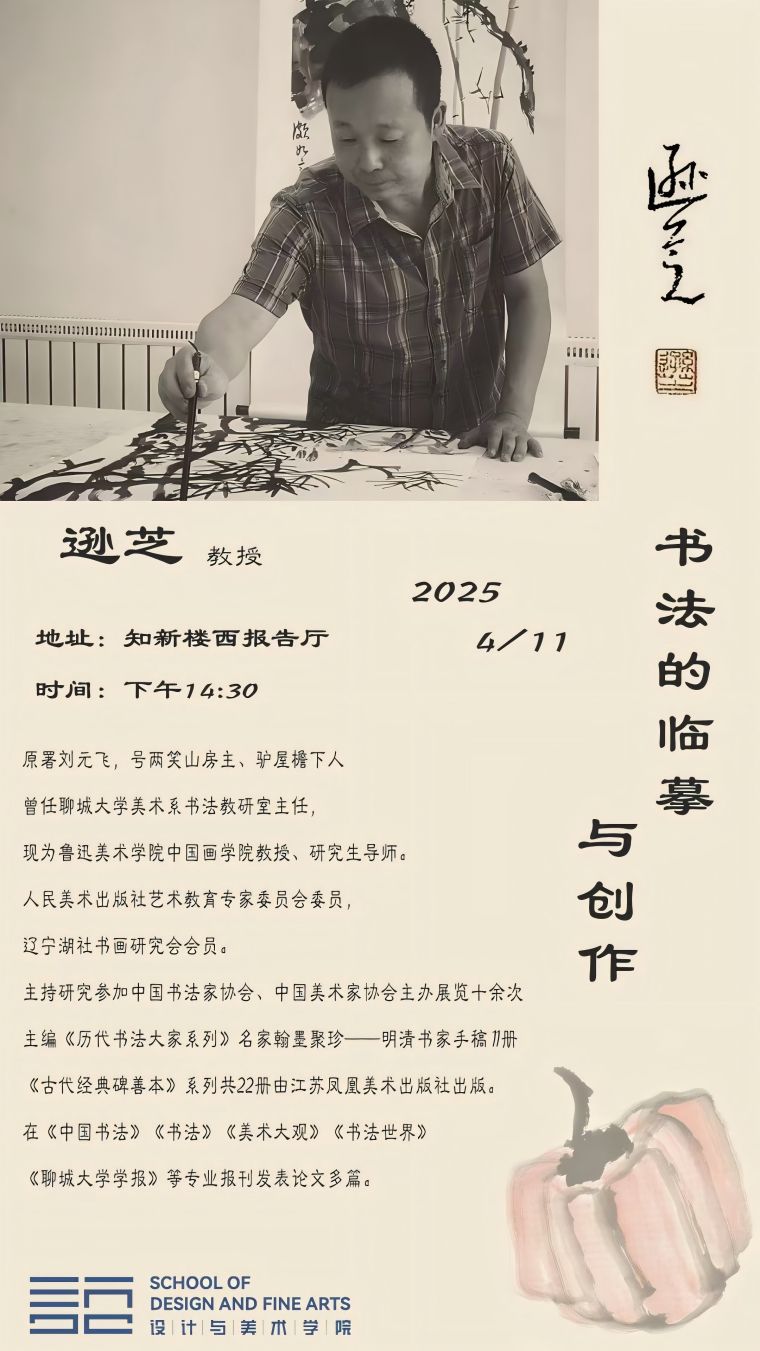 为了进一步推动学院书法专业特色建设,通过书画相辅相成的讲解为书法专业的教学与创作提供新思路。2025年4月11日下午14:30-17:30学院邀请到鲁迅美术学院教授,硕士研究生导师,中国书法家协会会员刘元飞教授于800cc全讯白菜网主站知新楼西报告厅为书法专业师生作“书法的临摹与创作”专题讲座。书法学专业学科带头人王民德教授,教师郑振天、张俊庭、杜林、韩紫默、侯怡及书法专业部分学生参加讲座。讲座由书法系主任董存建主持。
