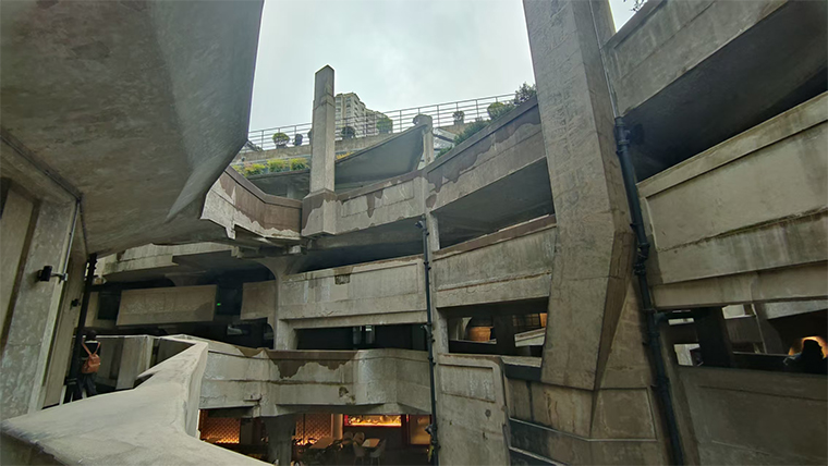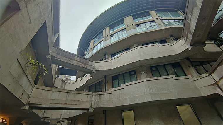 第一站是1933老场坊,由英国建筑师巴尔弗斯设计,建筑布局遵循严格的效率逻辑。中心八角形主楼为屠宰核心区,26座伞形柱支撑起无梁楼板,确保空间开阔;外围四层辅楼通过26座空中廊桥与主楼连接,形成思考:如何让新功能与旧灵魂对话,而非覆盖?