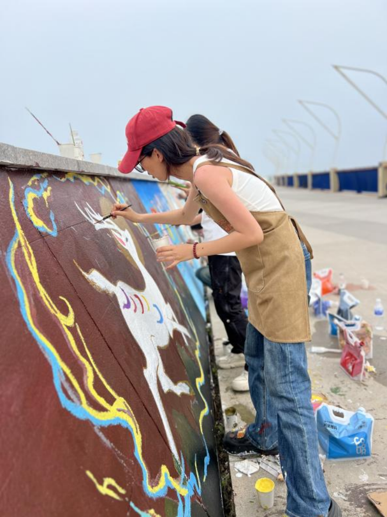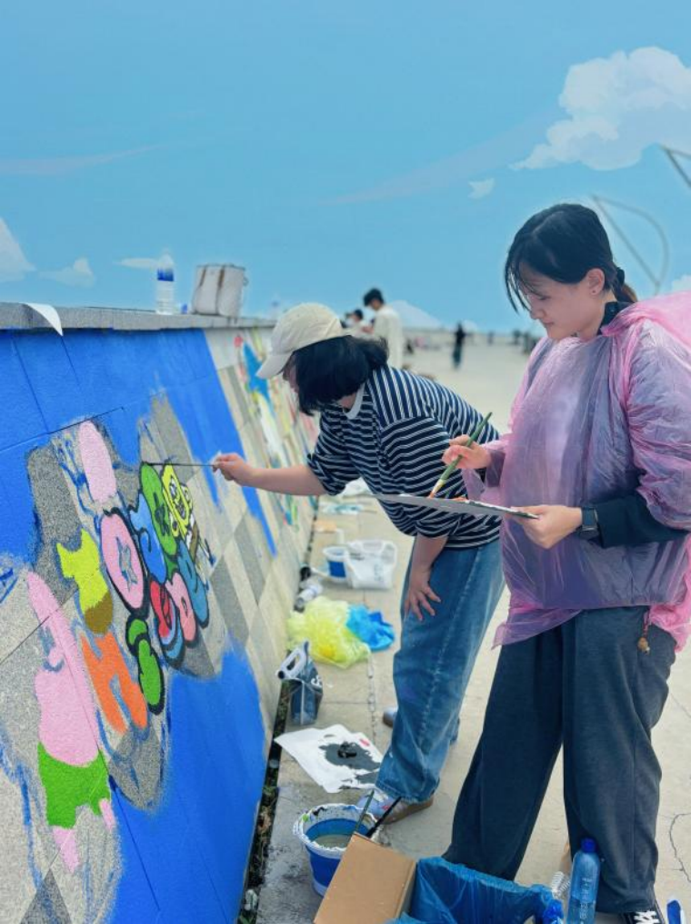 近日,800cc全讯白菜网主站设计与美术学院绘画系师生参加青岛西海岸新区星光岛海岸线1314米滨海步道+星愿灯塔创意墙绘活动。师生团队以海天一色为背景,以画笔为媒,在海岸线墙体上勾勒出充满活力的艺术图景,不仅让原本单调的海岸线成为一道绚丽的艺术风景线,更让学生们在实践中将课堂所学转化为实际创作。