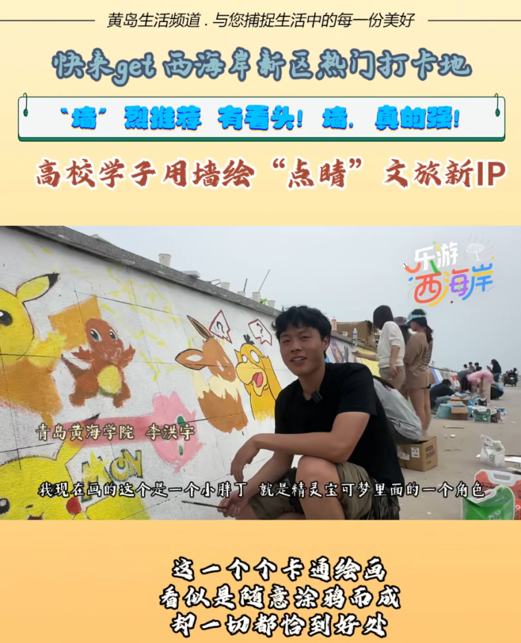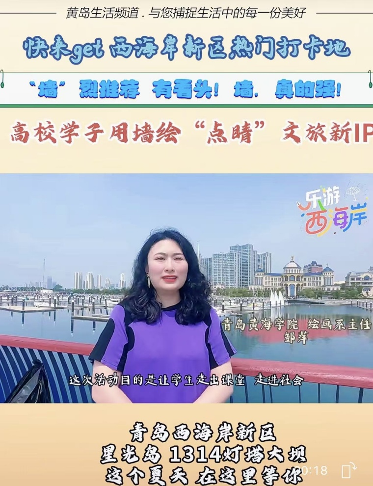 面对黄岛生活频道的采访,绘画系主任邹萍表示:“这次活动目的是让学生走出课堂,走进社会,进入到美好的实践中去。青岛是沿海地区,我们想通过这次公益活动助力地域发展。想让这种艺术活动走进千家万户,让更多的游客来到这里打卡。”参与创作的学生李洪宇兴奋地分享道:“画墙绘是非常有意义的体验,真正完成这幅画的时候,大家是非常开心的。”