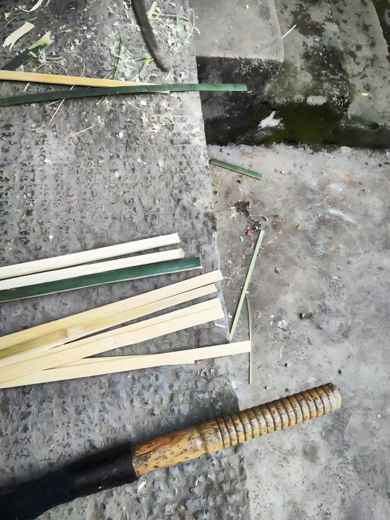 杨豪杰和爷爷便开始了共同创作之路。老人粗糙却稳健的手掌抚过青竹,刀锋过处,竹屑如时光碎屑般簌簑落下。他精心削制的竹片厚薄有致、温润光滑,几十年与竹相伴的智慧与对孙辈的期许,都凝练在这方寸之间。“竹子有灵性,顺着它的纹理走,劲道才足。”爷爷朴素的叮嘱,成为杨豪杰艺术探索的起点——这些带着祖辈体温与山居印记的竹片,是亲情的信物,更是民间智慧的无声传承。