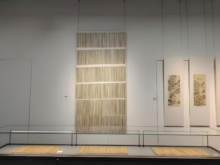 悬挂式阵列: 竹简垂直悬挂,形成宏大的视觉画面,凸显简牍作为历史文化载体的整体规模与气势。