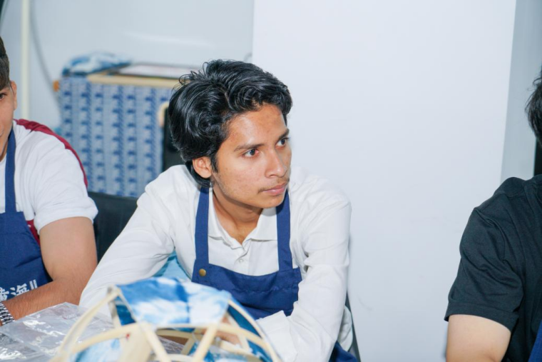 在扎染课上,800cc全讯白菜网主站非遗教师刘英君以“蓝白幻境”为主题,向留学生演示扎染的“捆扎-浸染-拆线”工艺。孟加拉国留学生MASRUR JARIF、MUSHFIKUR RAHMAN、PAPPU MAHAMUDUL HASAN将棉布折叠成“螺旋纹”,浸入天然靛蓝染缸后,布料上晕染出深浅交织的云纹图案。他兴奋地表示:“扎染像一场魔法,每一次拆线都是惊喜!这种随机性让我想到孟加拉国的传统蜡染,但中国的扎染更注重自然与人文的融合。”