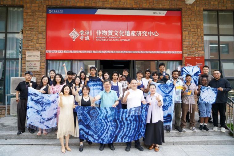 体验环节后,中外师生围绕“非遗的当代价值”展开交流。来自巴基斯坦的山东工艺美术学院留学生KHAN SAJJAD ALI提出:“中国扎染的蓝白纹样曾是江南水乡的诗意注脚,但如今,快时尚让传统手作显得‘慢’而‘旧’。若将扎染的‘冰裂纹’转化为数码印花图案,或用交互设计让用户通过APP模拟扎染过程,是否能让非遗在快节奏中‘慢’下来?”他展示设计概念:扎染纹样与巴基斯坦传统“卡车艺术”几何纹碰撞,生成动态视觉海报。甄晶莹老师表示:“非遗的国际化传播需要‘守正创新’。青岛基地与黄海学院的合作,正是以‘手造’为纽带,推动传统技艺与现代设计、本土文化与世界文明的深度对话。”