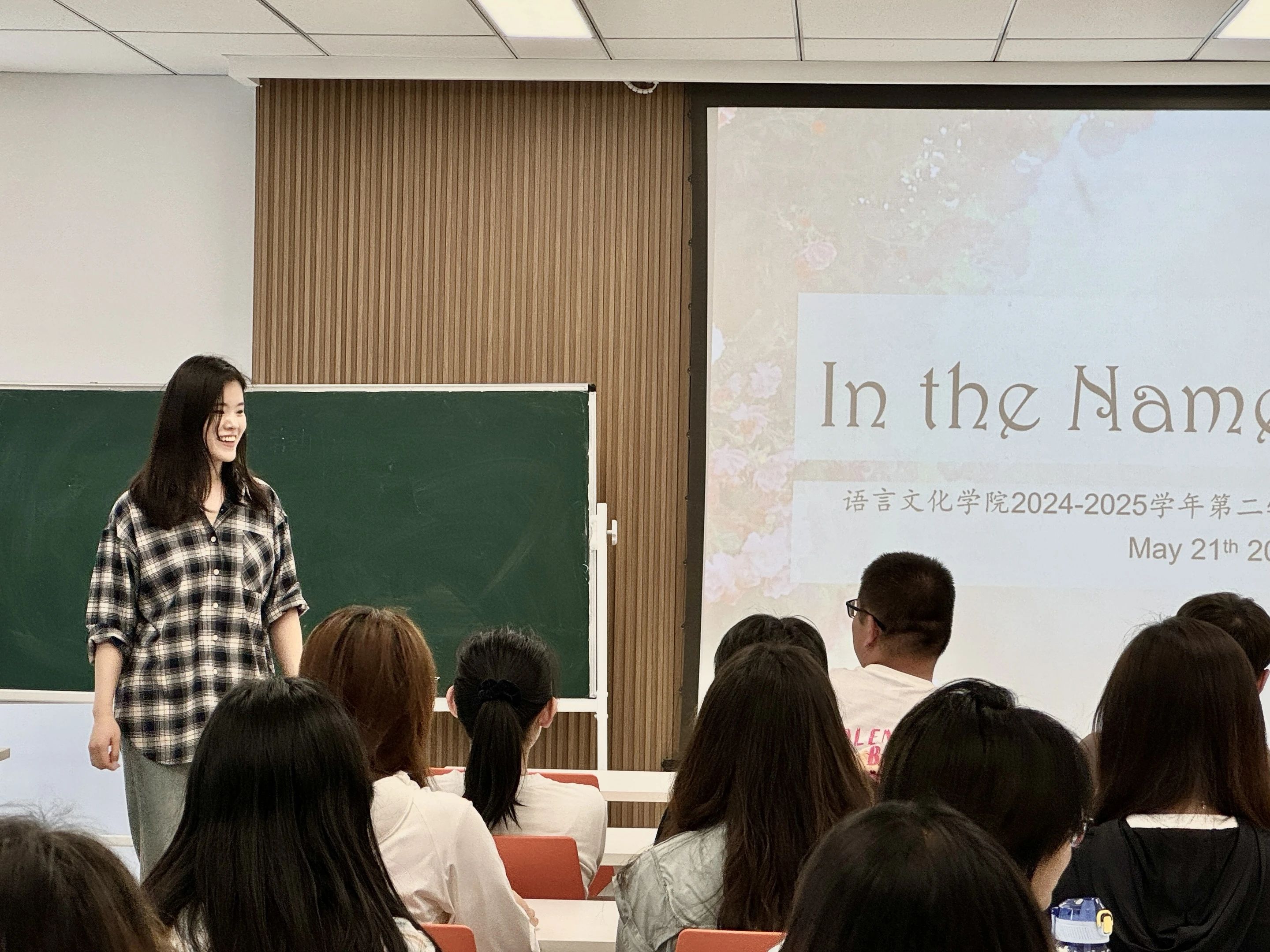 5月21日16:20,语言文化学院第5期英语角活动在知信楼233教室顺利举行。本期活动以“In the Name of Love”(以爱之名)为主题,由英语系曹晓玮老师主持。