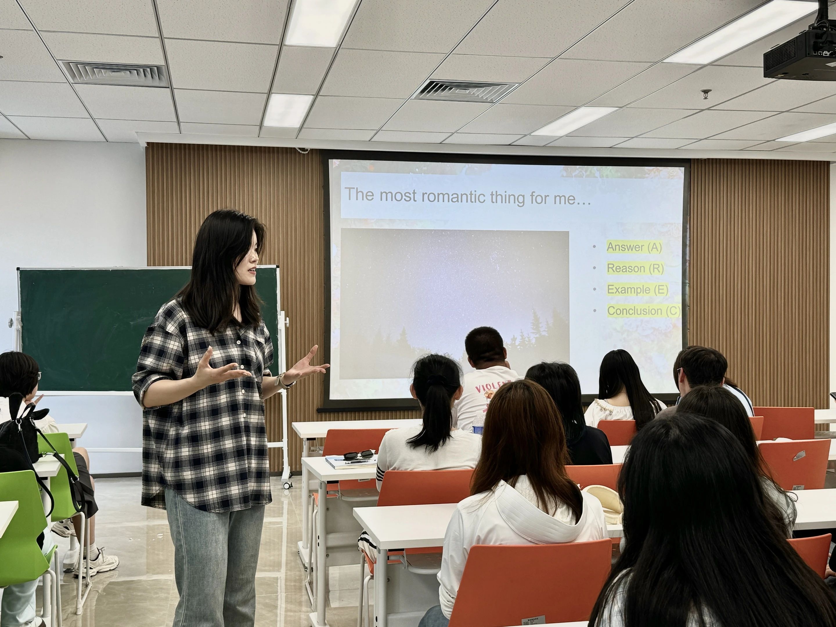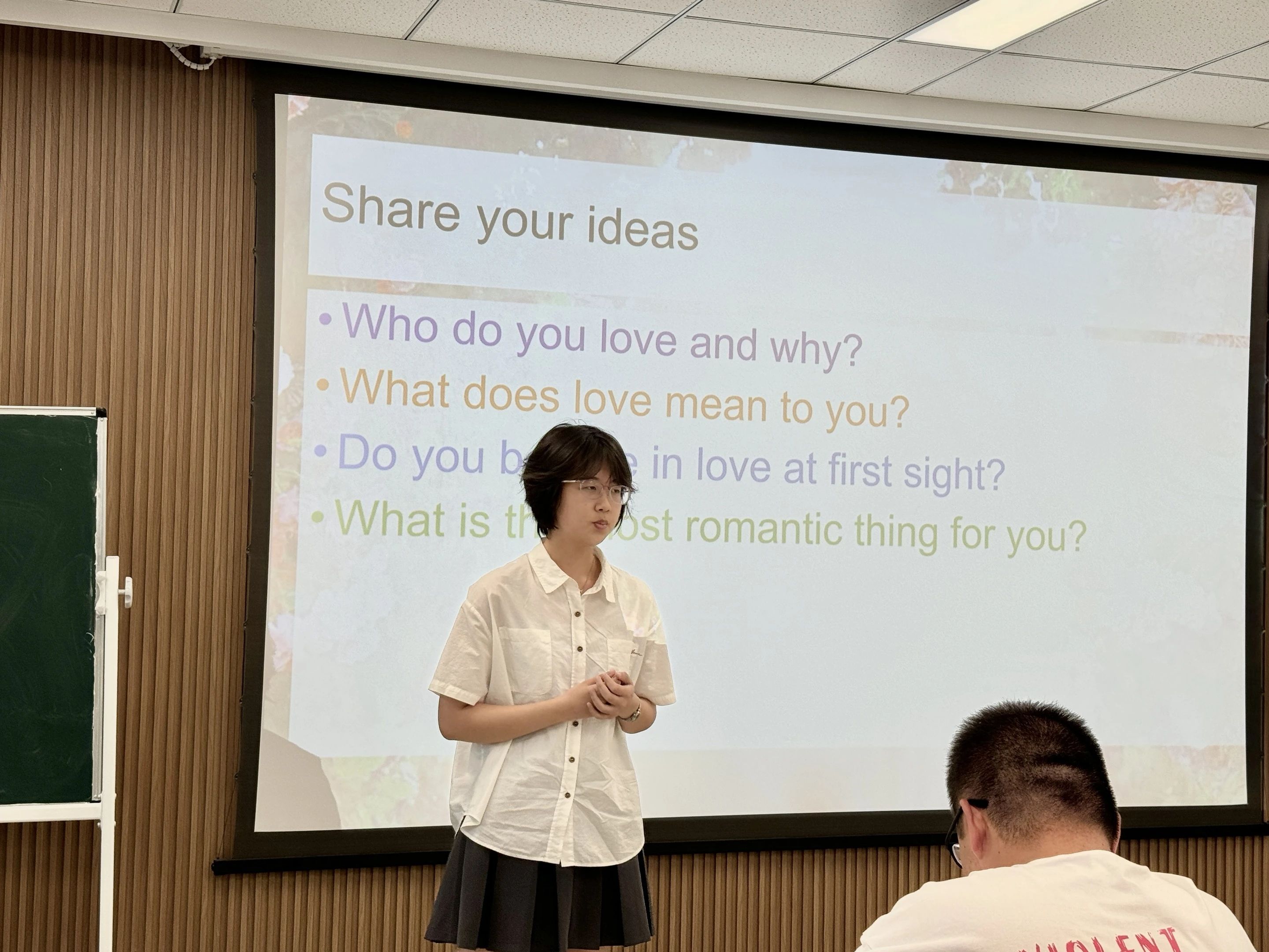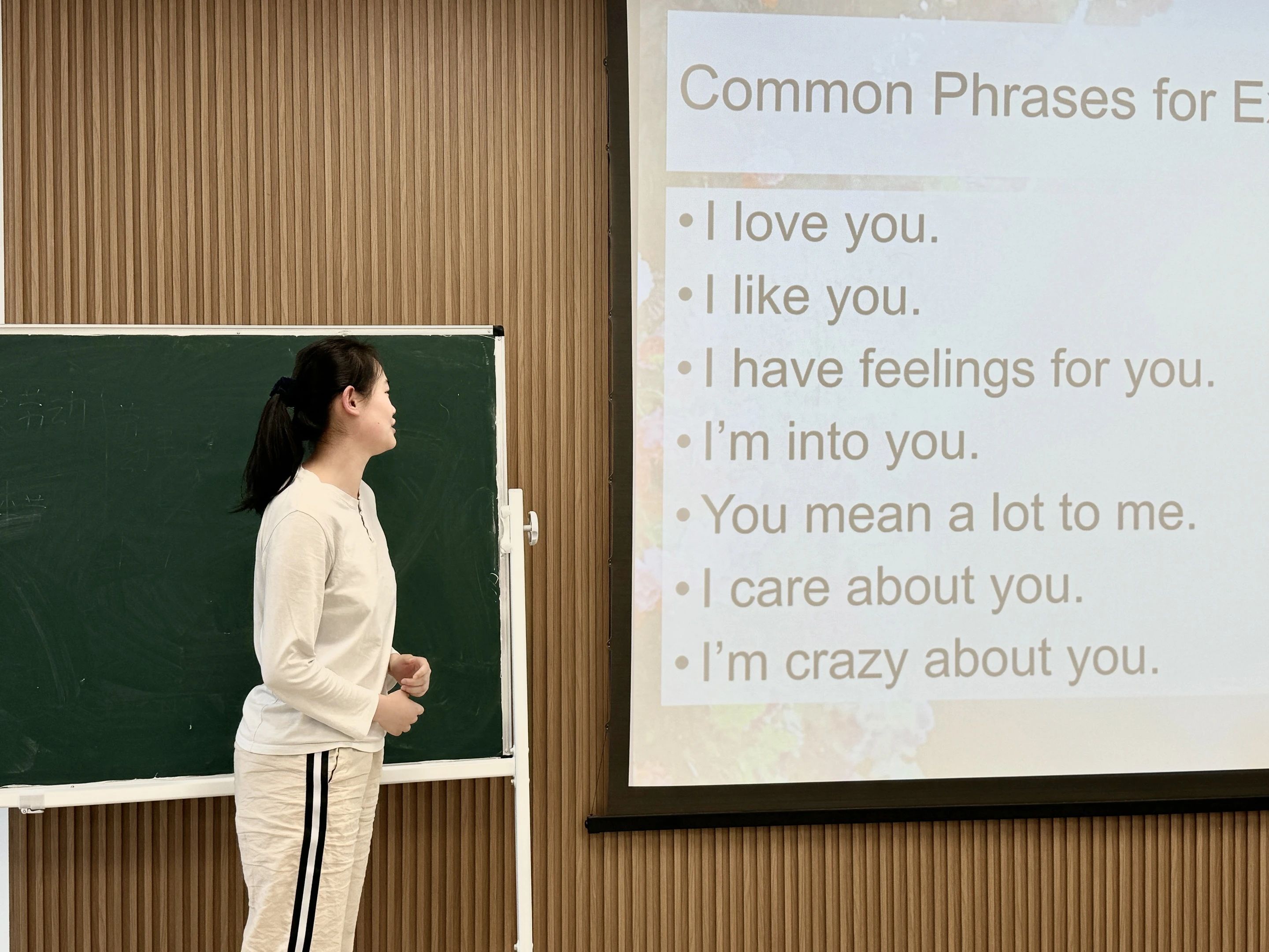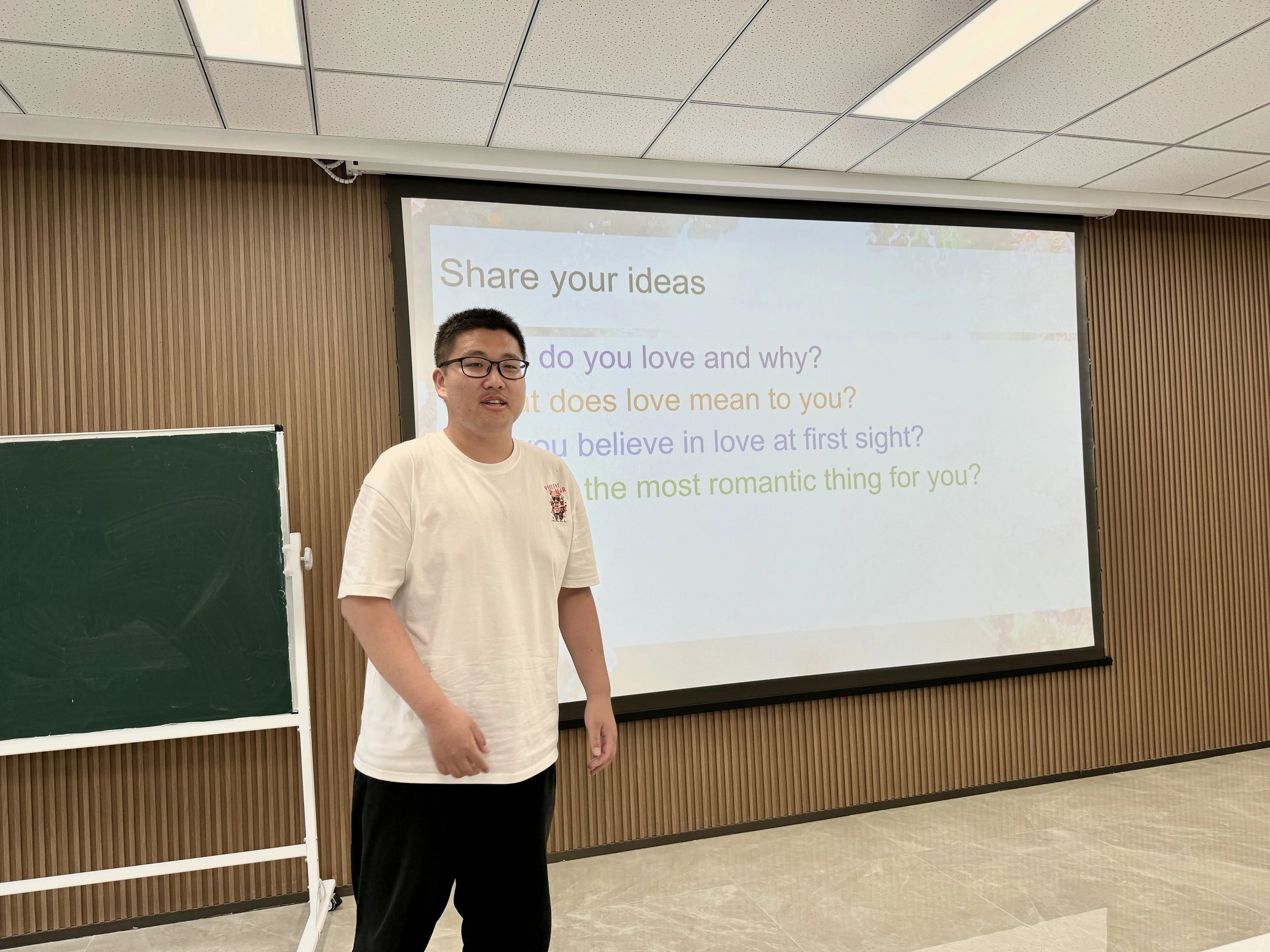 在最后的主题讨论环节,同学们围绕“爱与浪漫”展开深入交流,用英语分享了各自的观点和故事。从亲情的温暖到友情的纯粹,从生活中的“小确幸”到跨越山海的深情,词词真挚、句句动人。这些温柔的话语不仅传递了爱的力量,也让英语角现场洋溢着温馨与感动。