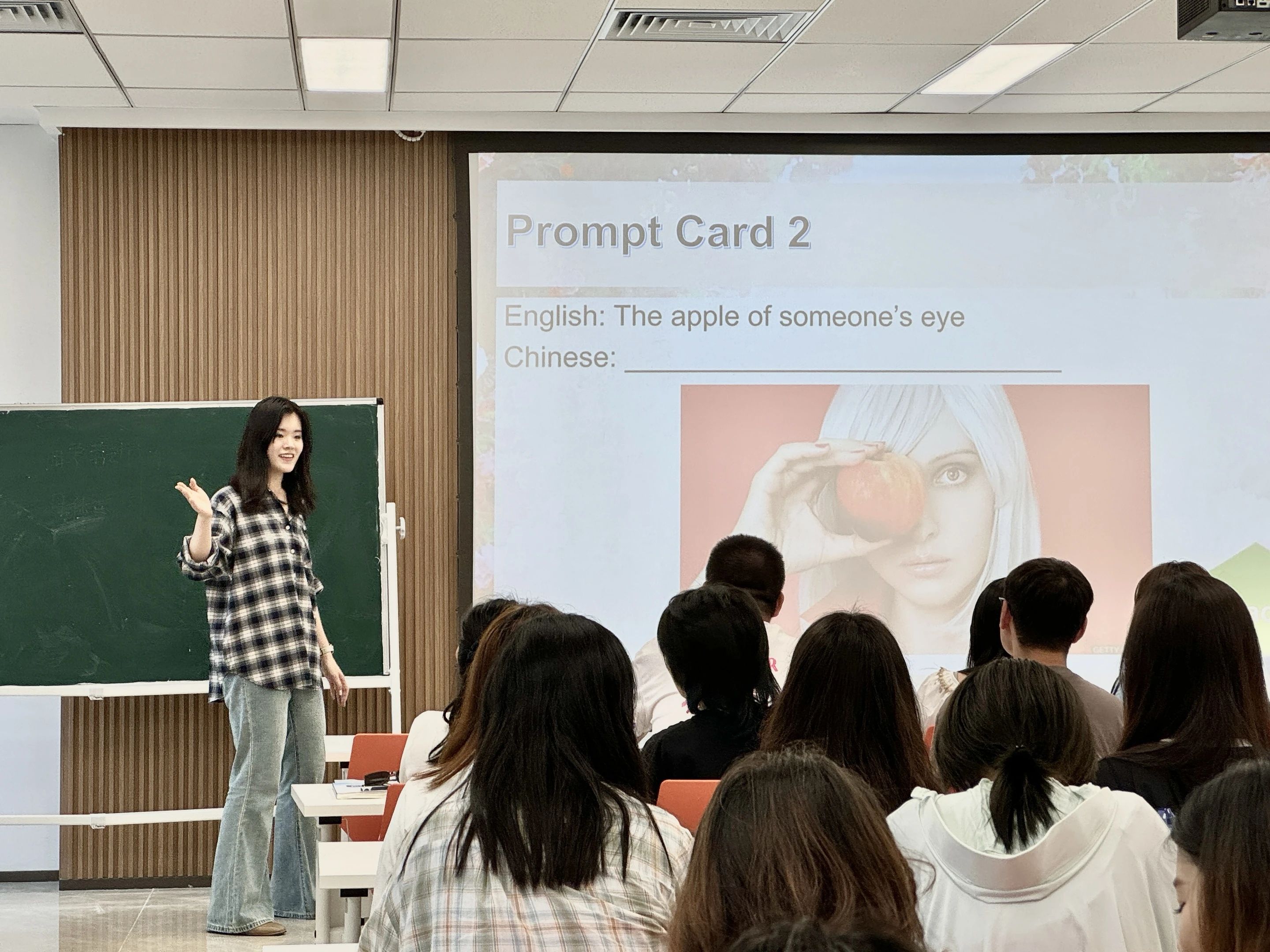 紧接着,活动进入了“俚语猜谜”环节。曹老师借此向同学们强调了语言学习中掌握习语(idioms)的重要性,鼓励大家关注地道表达、提升语言运用能力。同学们随机抽取卡片并上台用英语分享观点,活动过程中笑声不断,碰撞出思维的火花,大家在轻松愉快的氛围中对爱与浪漫有了更深的理解。