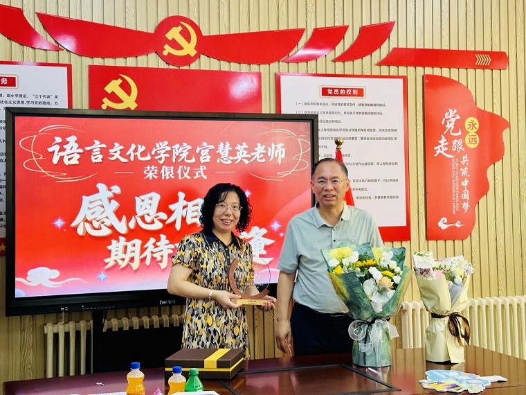 在热烈的掌声中,宫慧英老师走上台前。武学锋副院长为她颁发荣休纪念章,凝结着语言文化学院对她二十五年来默默奉献的深深感谢。教师代表献上的鲜花,不仅映衬着此刻的光荣,更象征着桃李满园的芬芳。