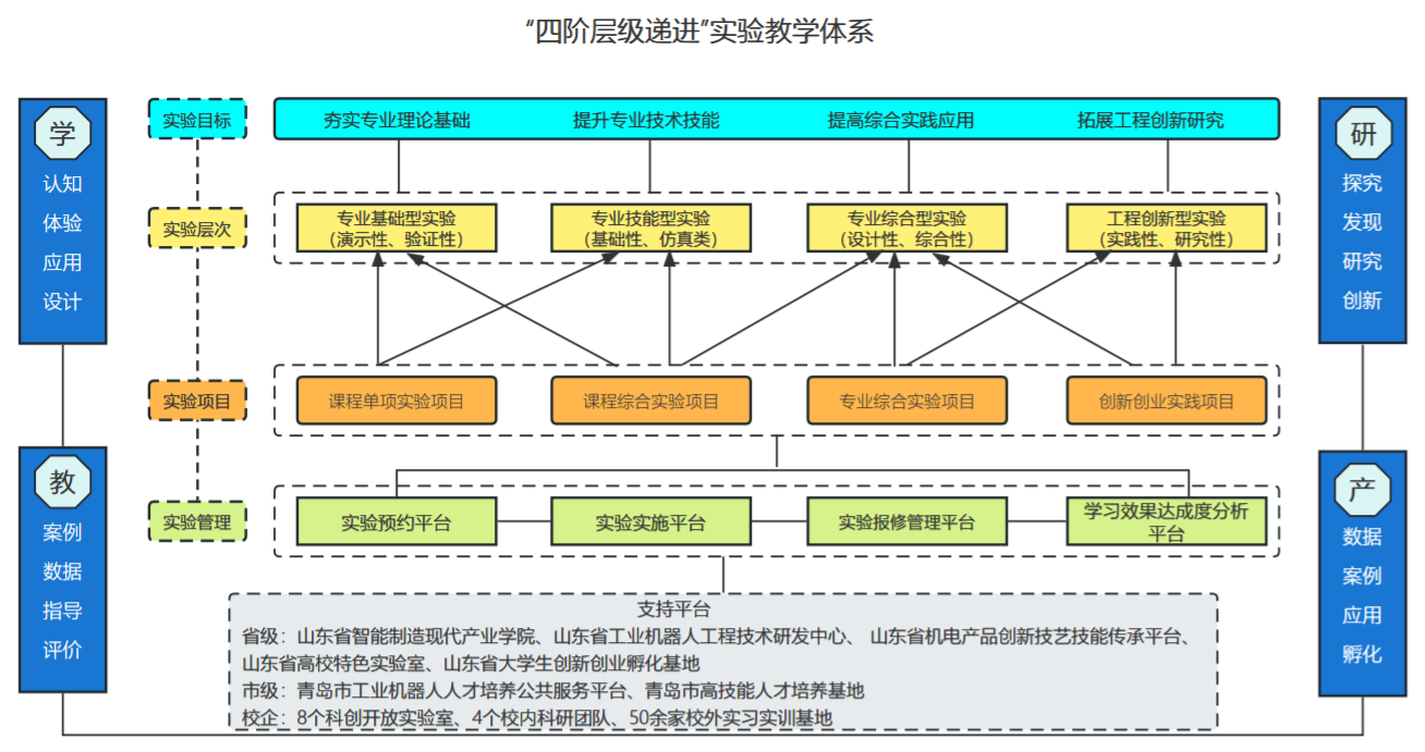 智能制造工程实验实践教学中心主要面向船舶与海洋工程、机械设计制造及其自动化、智能制造工程、电气工程及其自动化、机器人工程等专业,开展实验实践教学活动,并承担课程设计、生产实习、毕业设计、创新实践及科研等实践活动。坚持“面向产业、强化实践”的人才培养指导思想,提出“厚基础、强应用、分层次、重开放、促创新”的五项基本原则,以教学改革为切入点,以创新实践为要点,突出实践性教学环节,优化资源配置,构建了“基础型+技能型+综合型+工程型”层级递进实验实践教学体系,提高学生学习能力、实践能力与创新能力。