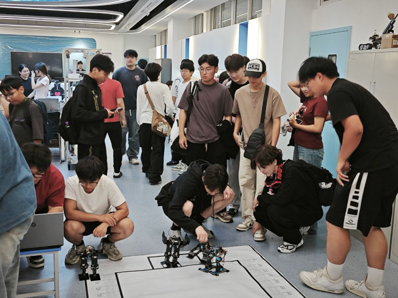 避障机器人赛道比赛、双足竞步机器人赛道比赛、循迹小车跑赛道等项目依次展开,每个项目都充满挑战与乐趣。在创新工作室学生和老师的悉心指导下,研学高中生们热情高涨,从基础的机器人操作,到亲自上手进行程序调试,全程深度参与。他们全神贯注地盯着屏幕,认真调整每一个参数,反复测试机器人的运行效果。现场气氛热烈,充满了欢声笑语与思维碰撞的火花,处处展现着青春与科技交融的活力。